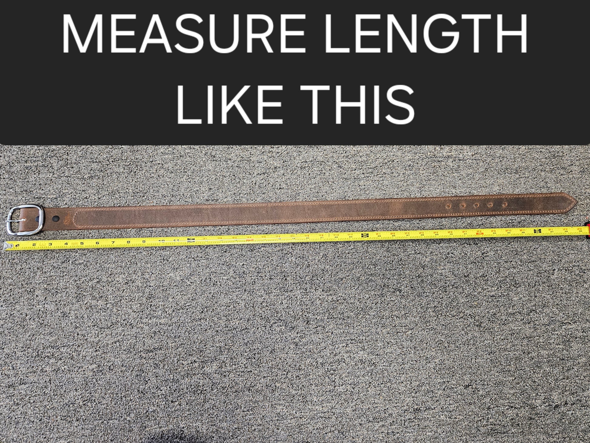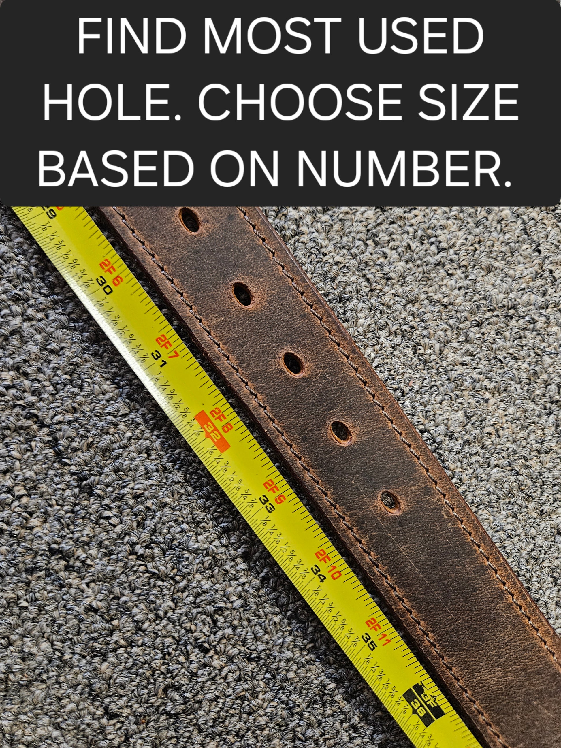 Please measure your current belt to the most used hole. Measure on the floor with a tape or ruler to your most used hole. If your measurement is in between sizes, go up to the next size. The belt ends have 5 holes so there is plenty of adjustment. The holes are spaced 1 inch apart.